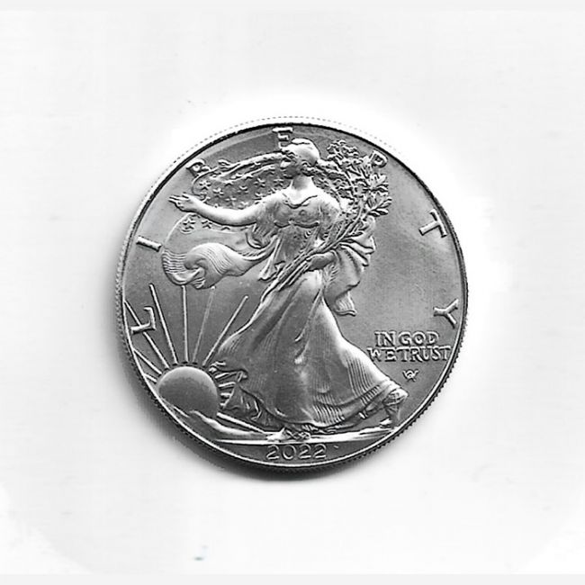 Stati Uniti d'America, moneta da 1 Dollaro in Argento "Liberty - Silver Eagle" anno 2022. Dollaro - Liberty Silver Eagle in argento 1 OZ. oncia in argento fino 0,999 anno 2022. Moneta fior di conio - peso 31,11 gr - diametro 40,6 mm -. Al dritto della moneta: Libertà che cammina verso sinistra, di lato la scritta IN GOD WE TRUST. Sul rovescio della moneta aquila che porta un ramo di quercia, di lato la scritta in latino "E PLURIBUS UNUM" ( tra molti, uno).