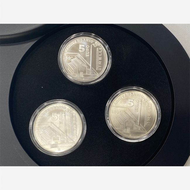 Repubblica Italiana, monetazione euro, trittico di monete da 5 euro in argento a commemorare il 150° anniversario della fondazione della Pirelli, inserite in confezione originale composta da un piccolo pneumatico. Al dritto della prima moneta da 5 euro la raffigurazione di un'automobile d'epoca con la pubblicità "PNEU PIRELLI" del 1914, in alto e in basso le date della fondazione 1872 e dell'emissione delle monete 2022, nella seconda moneta la riproduzione della pubblicità "PIRELLI-CINTAURO" del 1957, nella terza moneta la rappresentazione di un pneumatico PIRELLI. Al rovescio della tre monete è riprodotta la fabbrica PIRELLI. Le tre monete da 5 euro di nominale sono in argento 925%, in versione fior di conio.