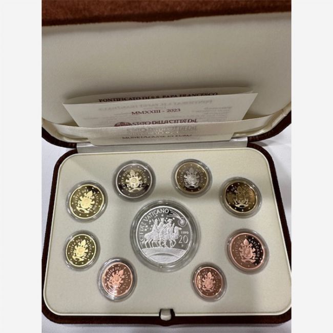 Monete euro della Città del Vaticano, pontificato di Papa Francesco, serie di monete divisionali in euro anno 2023 in versione fondo specchio, con moneta commemorativa da 20 euro in argento 925% proof. La serie è composta da 9 monete proof riunite in cofanetto (1-2-5-10-20-50 centesimi, 1-2- euro - e la moneta in argento da 20 euro) aventi al dritto la raffigurazione dello stemma di Papa Francesco con intorno la scritta Città del Vaticano, al rovescio è riportato il valore nominale della moneta accanto alla carta dell'Unione Europea, mentre la moneta in argento da 20 euro in versione fondo specchio raffigura i Re Magi in sella a due cavalli e ad un cammello che seguono la stella cometa, al rovescio della moneta è raffigurato lo stemma di Papa Francesco, intorno la scritta: FRANCISCVS PP. ANNO MMXXIII