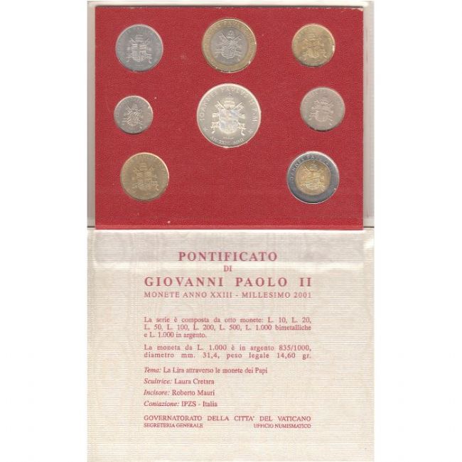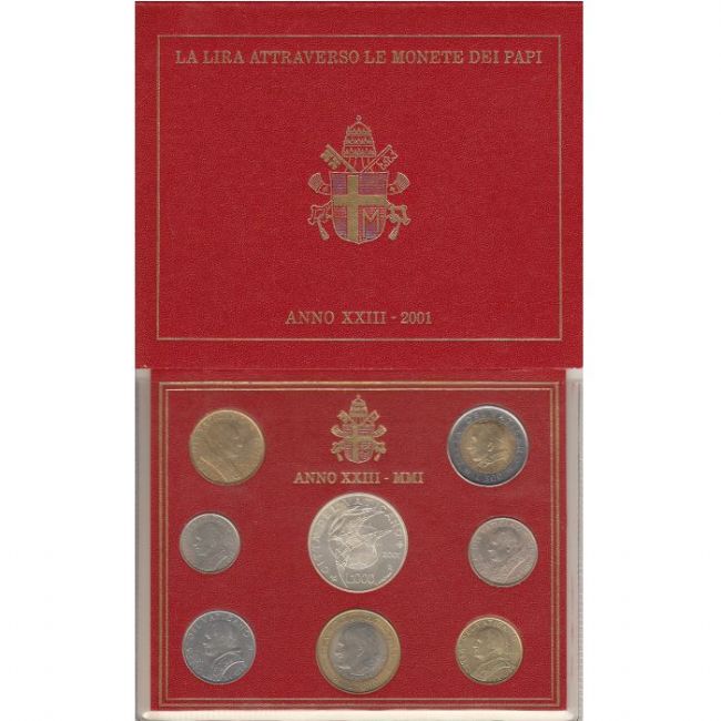 Serie monete divisionale coniato dalla Città del Vaticano nel 2001, il cofanetto composto da LIRE: 10,20,50,100,200,500 e 1000 in Argento commemora e raffigura la Lira attraverso le Monete dei Papi. Nelle varie monete sono raffigurati i volti dei Pontefici: Pio IX, Pio XI, Pio XII, Giovanni XXXIII, Paolo VI, Giovanni Paolo I, Giovanni Paolo II, Benedetto XVI.