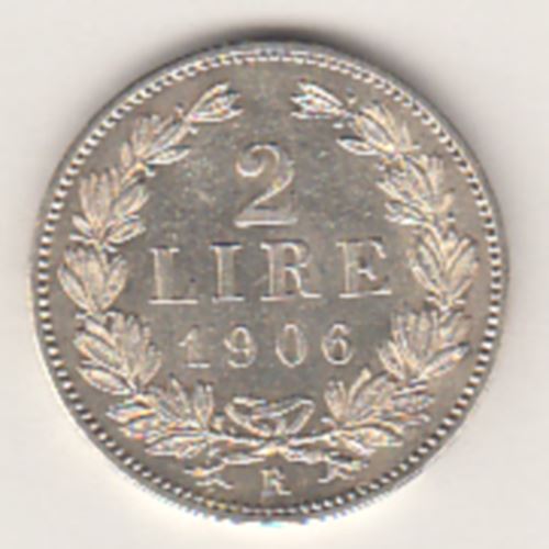 Moneta da 2 lire 1906 Repubblica di San Marino (prima monetazione 1864-1906). Nel dritto della moneta stemma a cuore coronato tra un ramo di lauro ed uno di quercia con tre torri all'interno, al retro la scritta 2 LIRE 1906 tra due rami di lauro. Moneta in argento .835% peso 10 g. nel cotorno la scritta LIBERTAS LIBERTAS. La Repubblica di San Marino è il più antico ed uno dei più piccoli Stati d'Europa (14 secolidi vita), tutto compreso nel territorio Italiano, da un documento dell'885 risulta che in quell'anno era già uno Stato indipendente.