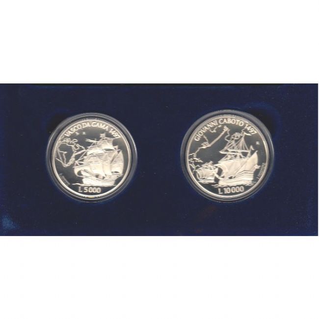 Dittico di monete commemorative in argento fondo specchio emesso dalla Repubblica di San Marino nel 1997 dedicate ai grandi navigatori Vasco de Gama e Caboto. Nella moneta da 5000 lire nel dritto in primo piano la nave usata da Vasco de Gama nel suo viaggio compiuto nel 1497 attorno al Capo di Buona Speranza. Nella moneta da 10000 lire sono raffigurate le due navi e la rotta che Giovanni Caboto segui' nel suo viaggio da Bristol a Terranova nel 1497. Le monete sono collocate nel loro astuccio.