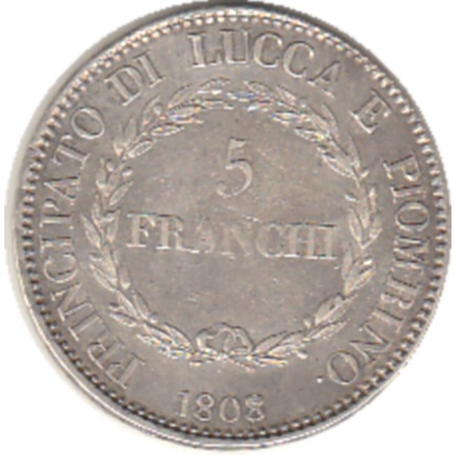 Principato di Lucca e Piombino, moneta da 5 franchi in argento, anno 1808 zecca di emissione Firenze. Al dritto della moneta busti di Elisa Bonaparte e Felice Baciocchi, al rovescio scritta intorno PRINCIPATO DI LUCCA E PIOMBINO con cifra al centro della moneta tra due rami di lauro legati in basso, sotto data 1805. Il 23 giugno su richiesta forzata del Senato di Lucca, Napoleone Bonaparte, costituisce il Principato di Lucca e Piombino, affidandolo alla sorella Elisa ed al cognato Felice Baciocchi.