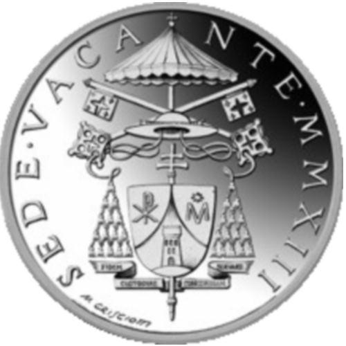 Moneta da 5 euro in argento 925/1000 fondo specchio "Sede Vacante 2013" emessa dalla Città del Vaticano. La Sede Vacante è il periodo che intercorre tra il termine di un pontificato e l'elezione di un nuovo Ponteficie durante il quale la reggenza della Santa Sede è affidata ad un governo provvisorio dai poteri limitati. Il giorno 11 febbraio 2013 il Santo Padre Benedatto XVI annunciò la sua decisione di rinunciare al ministero petrino dalle ore 20.00 del giorno 28 febbario, pertanto da tale data la Sede Apostolica divenne vacante sino alla nuova elezione del Ponteficie Papa Francesco I. La moneta è inserita nel suo astuccio.