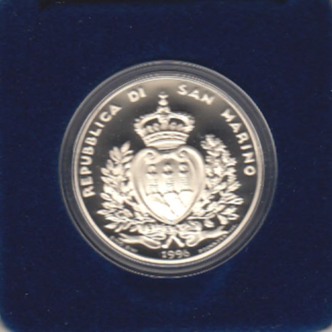 Moneta da 10.000 Lire emessa dalla Repubblica di San Marino nel 1996 in argento 835/1000 coniata in versione fondo specchio (proof) g.22. La moneta commemora la futura entrata dell'euro appunto da parte di San Marino, al verso della moneta in primo piano la Statua della Libertà ed il palazzo Pubblico, sullo sfondo il profilo geografico del continente Europeo con attorno dodici stelle e a destra la parola EURO.