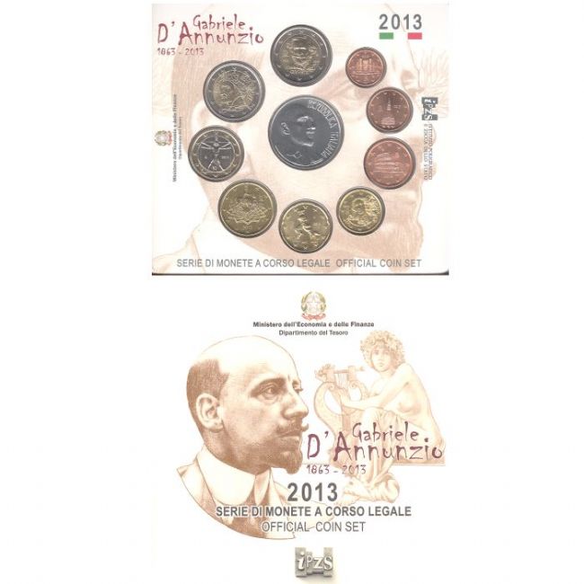 Serie di Monete in Euro anno 2013 che commemora il 150° anniversario della nascita di Grabriele d'Annunzio, la serie di monete è composta da moneta di 1-2-5-10-20-50 centesimi di euro e da moneta di 1-2 euro e con il 2€. commemorativo di Giuseppe Verdi, e dalla moneta da 5 euro in Argento fior di conio dedicata a Gabriele d'Annunzio.