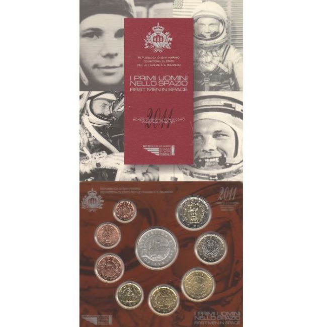 Serie Monete in Euro della Repubblica di San Marino 2011 versione fior di conio, dedicata ai Primi Uomini nello Spazio , la serie è composta da 1-2-5-10-20-50 centesimi di euro e da 1-2 euro e con la moneta da 5 euro in Argento 925/1000 dedicata ai primi uomini nello spazio. Nella moneta in argento in primo piano composizione con raffigurazione della rocca di San Marino, sul fondo il pianeta terra, a giro la legenda REPUBBLICA DI SAN MARINO. L'unione Sovietica riesce per prima ad inviare un eseere umano nello sapzio il 12 aprile 1961. A bordo della nave spaziale Vostok I, l'ufficiale JuriJ Gagarin (1934-1968) compie il primo volo orbitale attorno alla Terra, atterrando poi nella regione di Saratov.