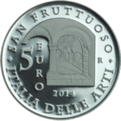 Moneta da 5 Euro in argento fondo specchio (proof) 925/1000 coniata dalla Zecca Polgrafico dello Stato della Repubblica Italiana anno 2014, tematica Italia delle arti "San Fruttuoso Liguria". Al dritto della moneta la raffigurazione dell'Abbazia di San Fruttuoso a Camogli (Genova), al rovescio della moneta particolare del chiostro inferiore dell'Abbazia di San Fruttuoso.