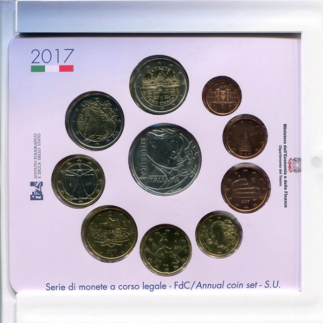 Repubblica Italiana, emissione numismatica della zecca poligrafico dello Stato per la serie divisionale di monete anno 2017 in versione fior di conio.
