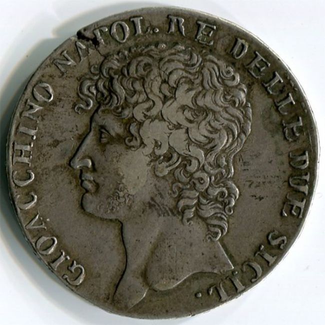 Al dritto della moneta testa di Murat a sinistra, al rovescio nel centro la scritta DODICI CARLINI tra un ramo d'ulivo ed uno stelo di grano con spighe, legati in basso con fiocco, nel contorno della moneta tra stelle in rilievo DIO PROTEGGE IL RE E IL REGNO. Gioacchino Murat che sposò Carolina Bonaparte sorella di Napoleone, per i suoi brillanti meriti militari venne nominato Re delle Due Sicilie il 15 luglio 1808 in sostituzione di Giuseppe Bonaparte che doveva assumere la corona di Spagna.
