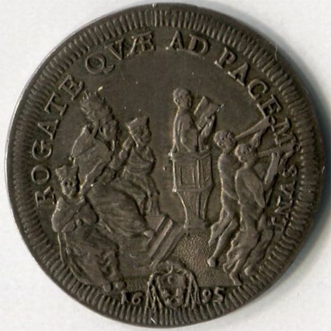 Stato Pontificio, Innocenzo XII (Antonio Pignatelli di Spinazzola) 1691-1700, Testone 1695 in argento. Al dritto della moneta stemma a vaso con piede sormontato da tiara con chiavi decussate e in alto testina e due anse a forma di cornucopia, al rovescio il Pontefice in trono tra due cardinali, davanti al Pontefice il pulpito e a destra due figure che suonano la tromba, sotto la data 1695e intorno la scritta ROGATE QVAE AD PACEM SVNT.