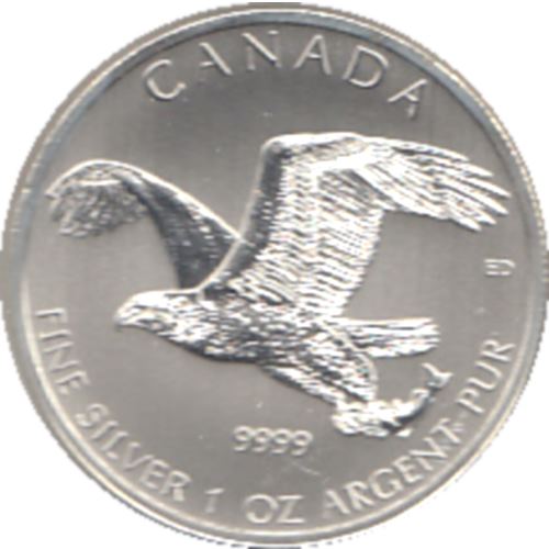 Moneta da 5 dollari d'argento del Canada 2014, serie Uccelli Rapaci celebrativa dell'Aquila Testabianca. Un oncia di argento fino 999/1000 gr.31,10 diametro 38 mm.Al dritto della moneta effigie della regina Elisabetta II al rovescio immagine dell'aquila in volo.
