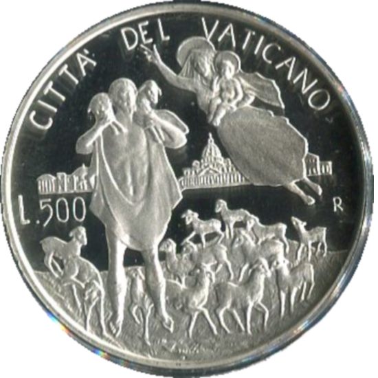 Città del Vaticano, Giovanni Paolo II, moneta in argento versione fondo specchio (proof) da 500 lire a commemorare il 50 anniversario del sacerdozio di Giovanni Paolo II anno 1996. Contorno in rilievo: EXEUNTE ANNO QUINQUAGESIMO SACERDOTII. Moneta confezionata in astuccio.