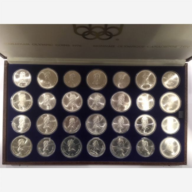 Canada, monete olimpiche canadesi per la celebrazione delle olimpiadi di Montreal del 1976. Il set è composto da 28 monete in argento 925%, di cui 14 da 5 dollari e 14 da 10 dollari. Ogni moneta da 5 dollari pesa 24,30 grammi mentre il 10 dollari pesa 48,60 grammi, tutte sono inserite nella propria capsula e collocate in un elegante cofanetto in legno emesso per l'evento.