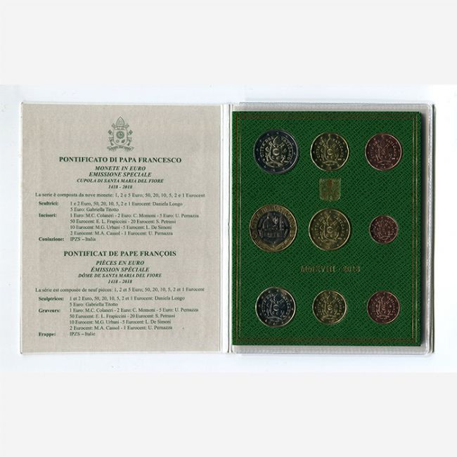 Città del Vaticano, pontificato di Papa Francesco, emissione speciale - cupola di Santa Maria del Fiore - serie di monete in euro versione fior di conio con moneta bimetallica da 5 euro, anno 2018. La serie è composta da 9 monete: 5 euro commemorativa, 2 e 1 euro, 50,20,10,5,2,1 Eurocent.