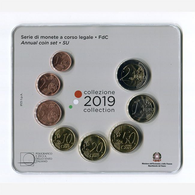 Repubblica Italiana, Ministero dell'Economia e delle Finanze Dipartimento del Tesoro, emissione numismatica per la collezione di monete euro a corso legale, serie di monete versione fior di conio (fdc) anno 2019, annual coin set, coniate dalla zecca poligrafico dello Stato Italiano. Il set di monete euro è composta da: 1-2-5-10-20-50 euro centesimi, 1-2 euro, tutte le monete sono riunite nella confezione originale della zecca.
