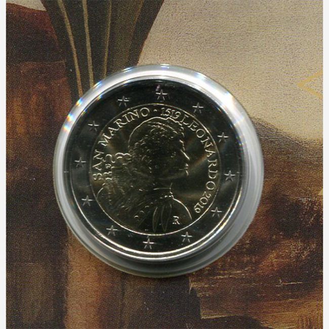 Repubblica di San Marino, moneta da 2 euro commemorativo in versione fior di conio anno 2019 emessa in occasione del 500° anniversario della scomparsa di Leonardo da Vinci. Il dritto della moneta da 2 euro che commemora il 500° anniversario della scomparsa di