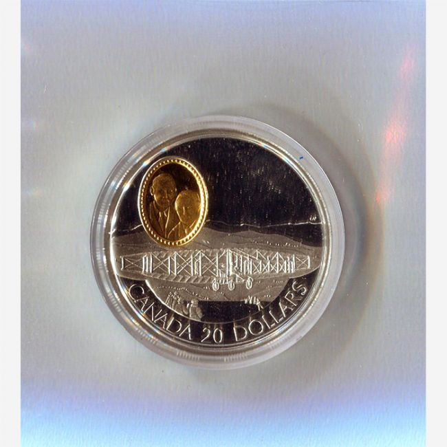 Canada, moneta commemorativa da 20 dollari fondo specchio (proof) in argento 925% della serie Aviazione Canadese.Al dritto della moneta la rappresentazione in volo del Silver Dart primo aereo costruito da un team canadese e statunitense, in alto a sinistra nel piccolo ovale l'immagine degli aviatori John A.D. McCurdy and F.W. Baldwinin oro 24 Kt Gold, al retro busto della Regina Elisabetta II con corona.La moneta è in confezione zecca originale.