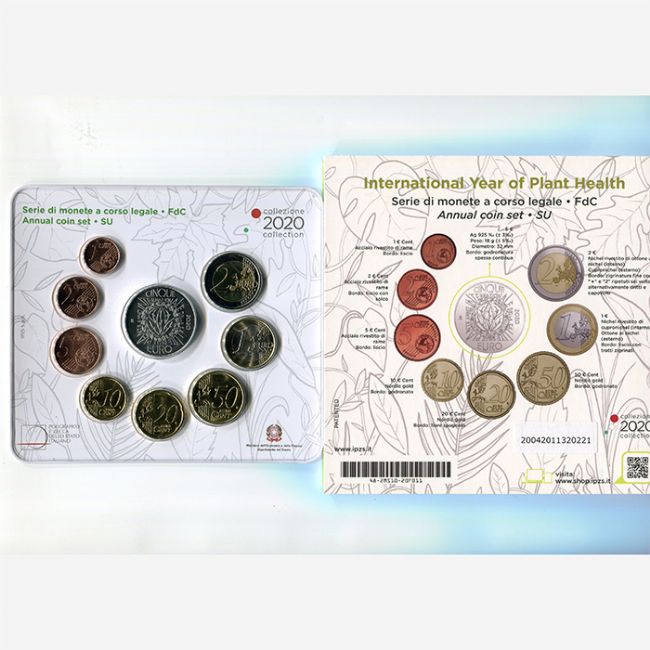 Repubblica Italiana, Ministero dell'Economia e delle Finanze Dipartimento del Tesoro, emissione numismatica per la collezione di monete euro a corso legale, annual coin set, coniate dalla zecca poligrafico dello Stato Italiano. Serie di monete euro versione fior di conio (fdc) anno 2020 con moneta commemorativa in argento da 5 euro, per celebrare l'anno internazionale della salute delle Piante. Il set di monete euro è composta da: 1-2-5-10-20-50 euro centesimi, 1-2 euro e 5 euro in argento 925%, tutte le monete sono riunite nella confezione originale della zecca.