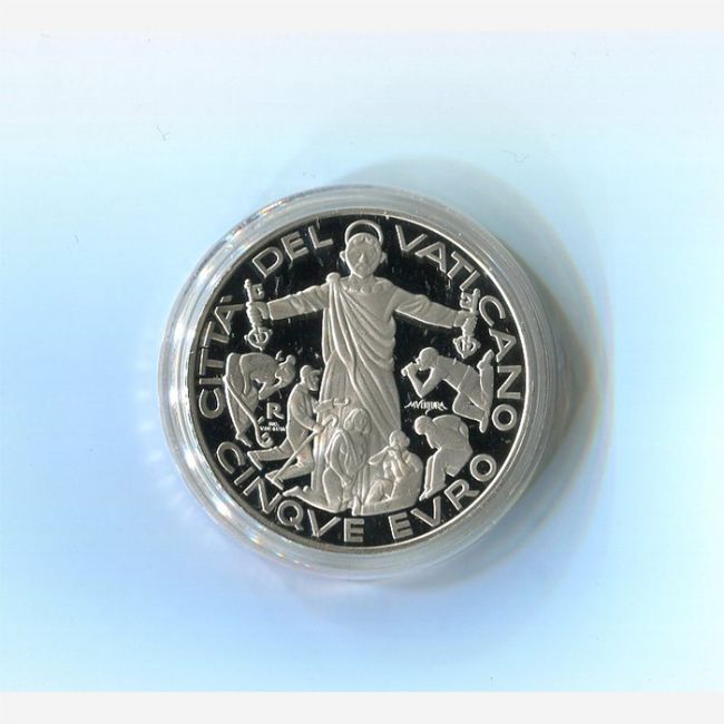 Monetazione euro della Città del Vaticano, pontificato di Papa Francesco, emissione in astuccio della moneta da 5 euro in argento 925/1000 in versione fondo specchio (proof) anno 2020 a celebrare la Giornata Mondiale del Migrante e del Rifugiato. Al dritto della moneta la raffigurazione di Pietro il Principe degli Apostoli, che accoglie protegge e provvede a tutti coloro che presso la Chiesa si rifugiano, nel rovescio le chiavi decussate e intorno la scritta FRANCISCVS PP. ANNO VIII.MMXX. al bordo della moneta la scritta MISERANDO ATQUE ELIGENDO + MMXX.