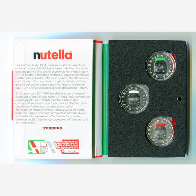 Monetazione euro, Repubblica Italiana, trittico di monete commemorative da 5 euro in argento, anno 2021, tematica dedicata alla serie di eccellenze Italiane per celebrare la la crema alle nocciole da spalmare più famosa al mondo, la Nutella. Le tre monete sono con elementi colorati, al dritto delle monete il tradizionale vasetto di Nutella, intorno la scritta REPUBBLICA ITALIANA. Al rovescio la riproduzione dello stabilimento italiano del Gruppo Ferrero, azienda specializzata dagli anni quaranta, anni in cui fu fondata, in prodotti dolciari. Moneta in argento 925/1000 - valore nominale 5 euro - 32 MM - 54 GR. - Fior di Conio (FDC) - Monete in confezione Astuccio -