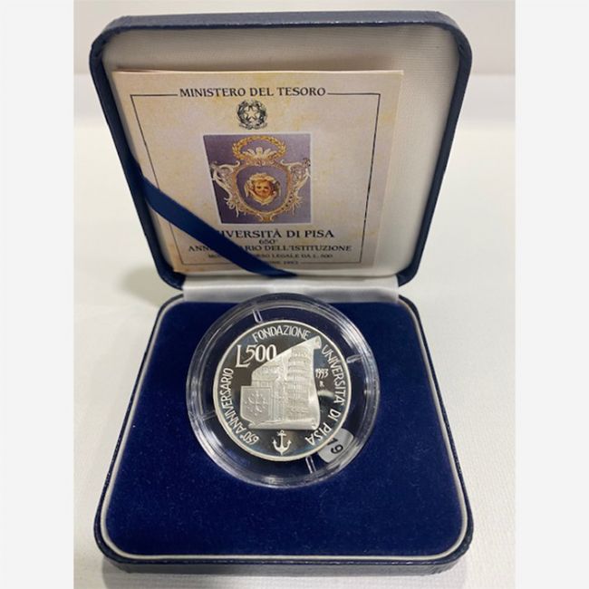 Repubblica Italiana, moneta da 500 lire in argento versione fondo specchio anno 1993 coniata per celebrare il 650° anniversario della fondazione dell'Università di Pisa. La moneta al dritto: figura femminile simboleggiante l'Italia, al rovescio: Architetture di Pisa con lo stemma della Città su un cartiglio. Moneta in argento 835/1000 - versione FS - Gr. 15 - MM. 32 -