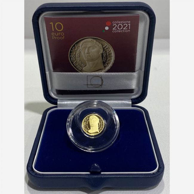 Repubblica Italiana, monetazione in euro, anno 2021, moneta da 10 euro in oro 900/1000 in versione fondo specchio emessa per celebrare e commemorare COSTANTINO nell'ambito della serie Imperatori Romani - COSTANTINE Roman Emperors Series -. Al dritto della moneta testa di Costantino presa dalla statua colossale in marmo proveniente dall'abside della Basilica di Massenzio di Roma, al rovescio al centro della moneta particolare dell'arco di Costantino di Roma dedicato all'imperatore romano contro Massenzio nella battaglia di Ponte Milvio raffigurante la Vittoria Alata. Caratteristiche della moneta: valore nominale 10 euro - Oro 900/1000 - Gr. 3 - diametro 13,85 mm - Proof - tiratura 1200 pz. -