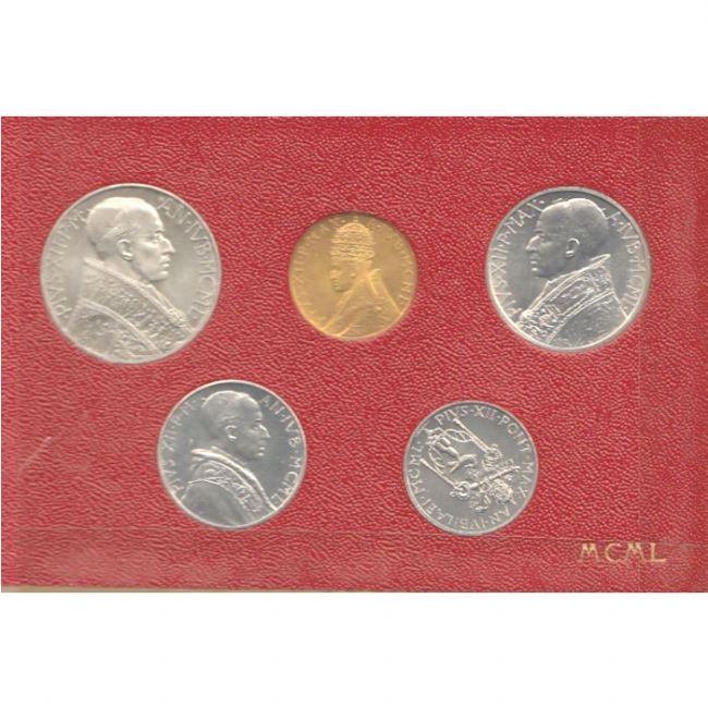 Serie di monete annata completa del 1950, emessa dalla Città del Vaticano nella sua confezione originale in occasione dell'Anno Santo. La serie è composta da 4 monete da 1;2;5 e 10 lire del tipo Italma e dal 100 lire in oro. Il soggetto delle monete sono l'effigie del Pontefice PIO XII nel dritto e dell'apertura della Porta Santa nel retro, eccezion fatta per la moneta da 2 lire che riproduce l'immagine della colomba che vola sopra la Cupola di San Pietro. Stato delle monete fior di conio.