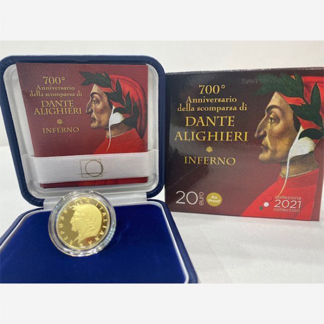 Monetazione euro, Repubblica Italiana, collezione 2021, moneta celebrativa da 20 euro in oro versione fondo specchio per il 700° Anniversario della scomparsa di Dante Alighieri, Inferno. Al dritto della moneta il profilo di Dante Alighieri, particolare ispirato da un'opera di Sandro Botticelli, al rovescio della moneta rappresentazione stilizzata dell'inferno dantesco con i novi gironi descritti nella Divina Commedia dove sono raffigurati le ali del diavolo, il fuoco e il ghiaccio. Specifiche tecniche: 20 euro in oro 900/1000 - GR. 6,54 - MM. 21 - Proof -