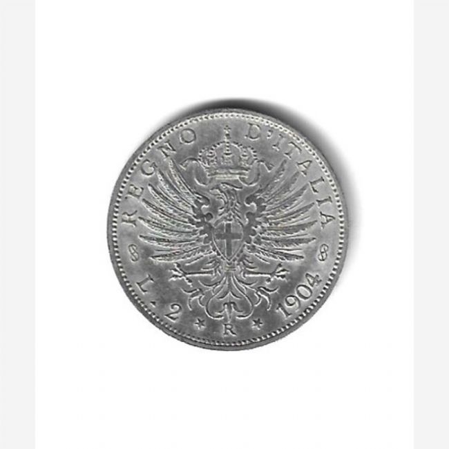 Monete del Regno d'Italia, Vittorio Emanuele III, 2 lire in argento del 1904, zecca Roma. Al dritto della moneta testa del Re e sotto il collo il nome dell'incisore Speranza, al rovescio Aquila araldica spiegata e coronata con lo scudo sabaudo nel petto, circolarmente fra due nodi la leggenda REGNO D'ITALIA, nel basso il segno di zecca tra due stellette, al contorno della moneta reca in incuso tre FERT tra nodi e rosette. Moneta in argento 835/1000.