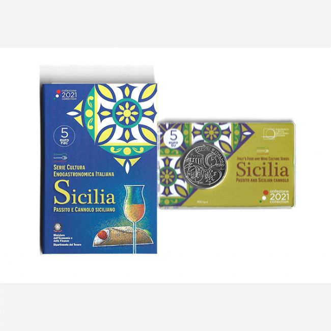 Monetazione euro, Repubblica Italiana, serie cultura Italiana, moneta da 5 euro in Cupronichel in confezione coin card. Al dritto della moneta la raffigurazione di due cannoli siciliani e un bicchiere di Passito in primo piano su una decorazione tipica della ceramica di Caltagirone, al retro simboli della Sicilia come il Tempio della Concordia della Valle dei Templi, il teatro di Taormina, e la Trinacria.