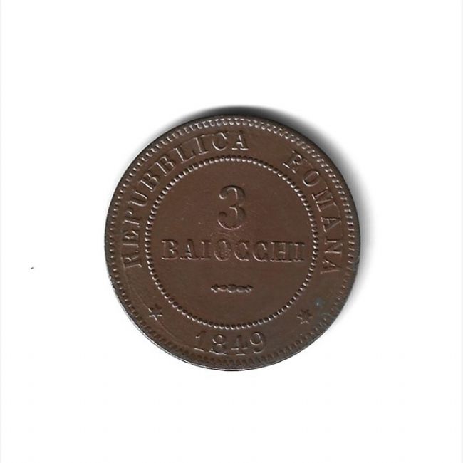 Monete degli Antichi Stati Italiani, seconda Repubblica Romana, 3 baiocchi rame anno 1849, 1 tipo, zecca Roma. Al dritto della moneta "3 baiocchi" con il 3 del valore arrotondato, intorno la scritta "REPUBBLICA ROMANA" entro cerchio perlinato, al rovescio Aquila su fascio entro corona di quercia, intorno la scritta "DIO E POPOLO", il contorno della moneta è liscio. Il 25 novembre il Papa Pio IX si rifugia a Gaeta per i moti popolari scoppiati a Roma, il 9 febbraio viene proclamata la Repubblica Romana, guidata da un triumviro costituito da Giuseppe Mazzini, Aurelio Saffi e Carlo Armellini.