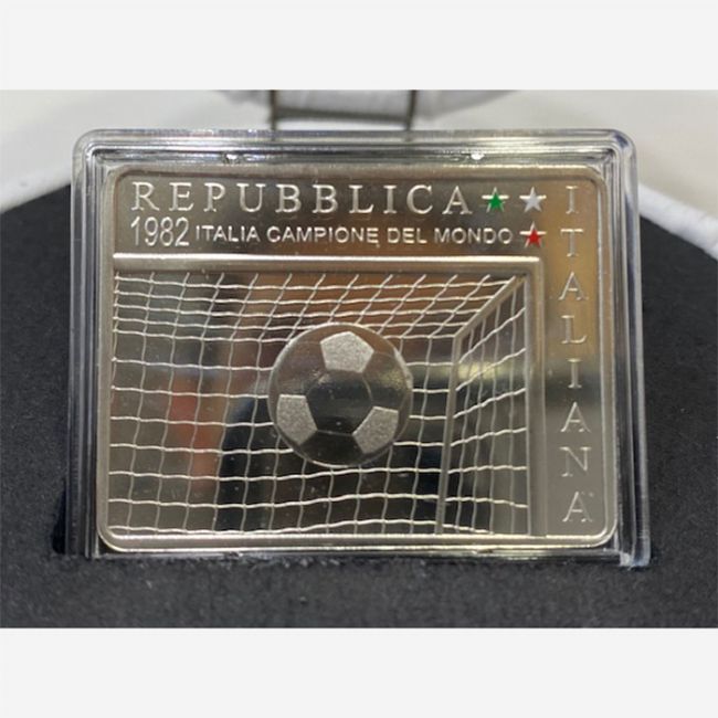 Monetazione euro, Repubblica Italiana, Istituto Poligrafico Zecca dello Stato, emissione celebrativa della moneta da 5 euro in argento versione fior di conio, anno 2022, a celebrare il 40° anniversario Italia Campione del Mondo e uno dei suoi più grandi protagonisti, Paolo Rossi. 5 euro coin, 40 anniversary of Italy World Champion 1982. Al dritto della moneta, la raffigurazione di un pallone al centro della rete di una porta di calcio dove sopra spiccano le tre stelle con i colori dell'Italia e la scritta ITALIA CAMPIONE DEL MONDO 1982. Al rovescio, in primo piano della moneta la figura del goleador e calciatore Paolo Rossi, nel gesto di esultanza. Caratteristiche della moneta: valore nominale 5 euro - moneta in argento 925/1000 - peso 18 gr. - forma rettangolare - versione FDC - La moneta e raccolta in un bellissimo ed originale cofanetto a forma di pallone.