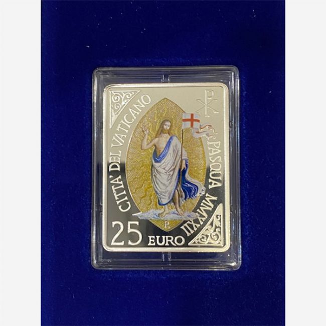 Monetazione in euro della Città del Vaticano, moneta rettangolare in argento da 25 euro, colorata in quadricromia dedicata alla festività della Santa Pasqua. La moneta nel dettaglio al dritto, rappresenta la raffigurazione del Cristo risorto, in un ovale di luce dorata, con vessillo con la croce in uno fondo bianco, ripreso dall'affresco del Pinturicchio "La Resurrezione" dei Musei Vaticani, come simbolo della resurrezione e il trionfo di Gesù sulla morte. Al rovescio della moneta lo Stemma di Papa Francesco. Moneta in argento 925/1000 - 35 gr. - versione fondo specchio (proof) - tiratura 1500 esemplari -
