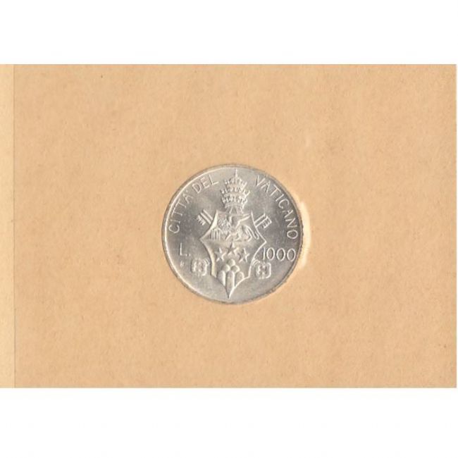 Moneta da 1000 lire in argento coniata dalla Città del Vaticano nel 1978 per Giovanni Paolo I (Cardinale Albini Luciani). Unica moneta emessa sotto il suo pontificato perchè fu eletto Papa il 26 agosto 1978 e morì improvvisamente nella notte tra il 28 e il 29 settembre dello stesso anno. La moneta coniata dalla Zecca Italiana entrò dopo la sua morte.