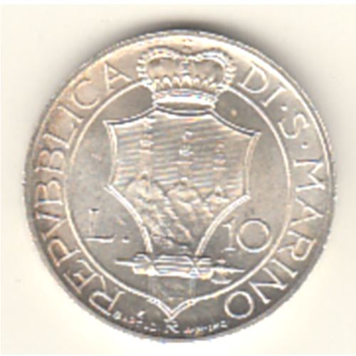 Moneta da 10 lire in argento 835/1000 coniata dalla Repubblica di San Marino, seconda monetazione (1931-1938). Al dritto della moneta stemma ottagonale coronato con le tre torri e poggiante su fascio littorio orizzontale, al rovescio busto di Sant'Agata di prospetto recante spada e corona, attorno la scritta IVSTITIA.SVPREMA.LAX.ESTO. La Repubblica di San Marino è il più antico ed uno dei più piccoli Stati d'Europa (14 secolidi vita), tutto compreso nel territorio Italiano, da un documento dell'885 risulta che in quell'anno era già uno Stato indipendente.